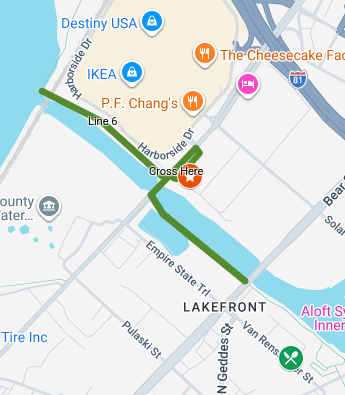The green line along Onondaga Creek is the Creekwalk. We are targeting the portion of the Creekwalk from Bear St., northwest to the lake. Use Hiawatha Blvd. to cross the Creek.