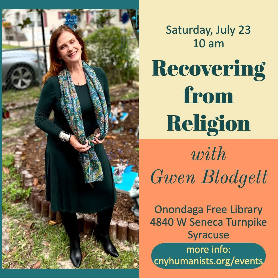 Former CNYHA Secretary, the brilliant Gwen Blodgett (formerly Bradshaw), will be talking to us about her experiences working with Recovering From Religion. RfR provides support and resources for those who are changing, doubting, or leaving their faith.